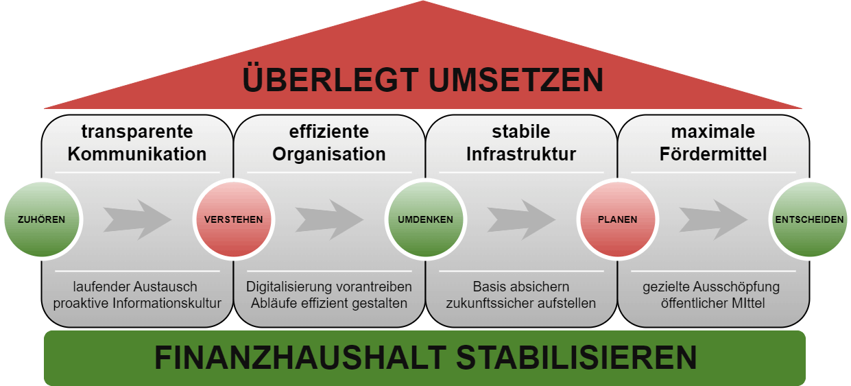 Als Grundlage beziehungsweise Fundament streben wir vorab einen stabilen Finanzhaushalt an, welcher die Basis für alle künftigen Aktivitäten, Maßnahmen und Projektierungen darstellt. Um Mühldorf langfristig zu einem noch lebenswerteren und attraktiveren Ort zu gestalten, zielen wir mit unserer Haltung auf alle Generationen ab. Beginnend mit der Förderung unserer Kinder, um Familien ein lebenswertes Umfeld zu schaffen, bis hin zur Unterstützung von Seniorinnen und Senioren, um generationenübergreifend einen wertevollen Zusammenhalt in unserer Gemeinde zu gewährleisten.